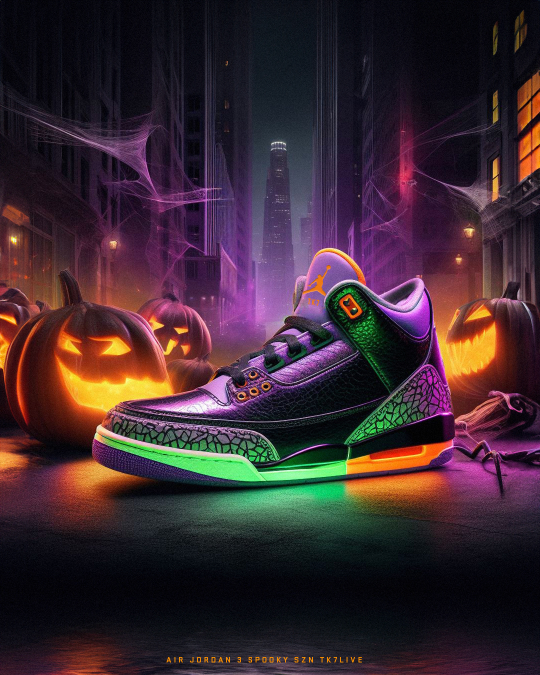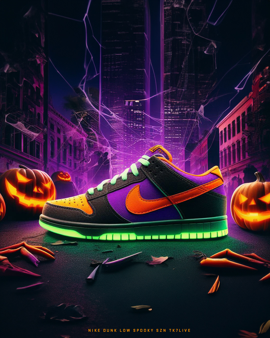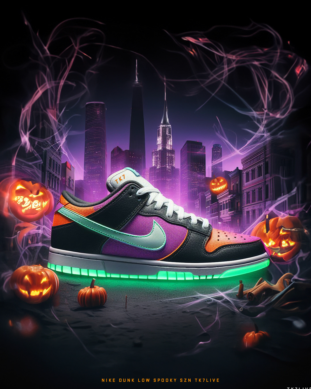 Embracing the spirit of Halloween, the sneakers showcase a vibrant color palette with shades of black, purple, green, and orange. The design transports enthusiasts to a captivating Halloween setting adorned with glowing pumpkins, intricate spiderwebs, bats, and a city skyline aglow with eerie purple lights. The Nike Spooky Sun collection seamlessly merges style and seasonal flair, creating a limited edition lineup that captures the essence of Halloween in every step.