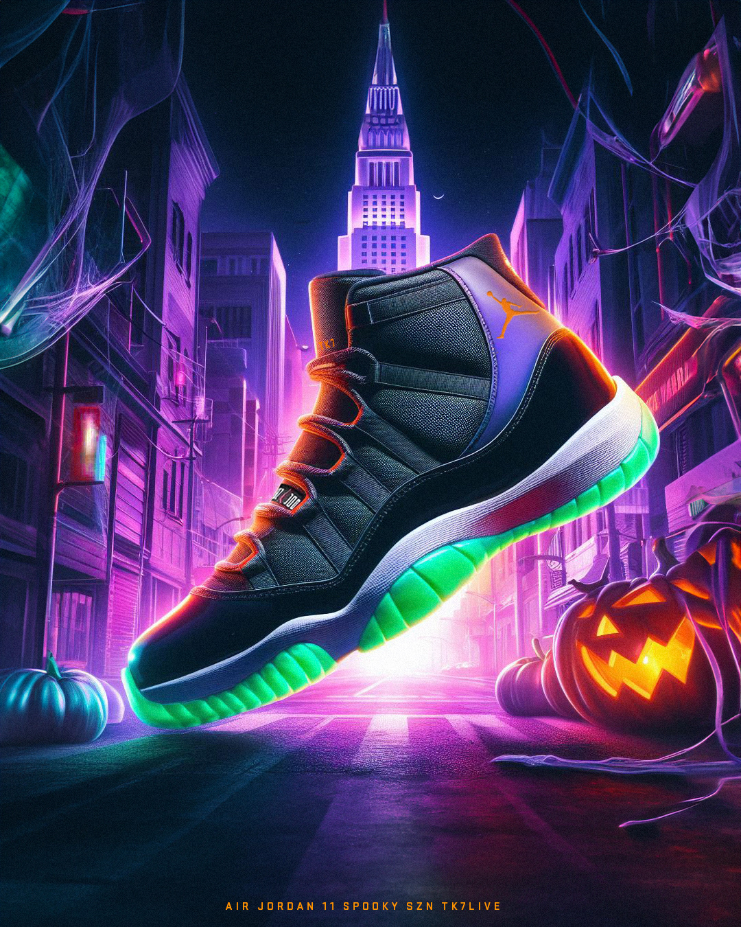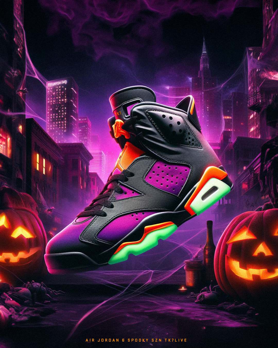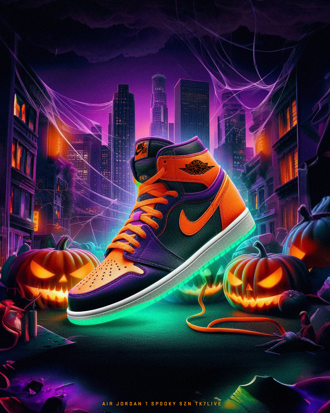 Embracing the spirit of Halloween, the sneakers showcase a vibrant color palette with shades of black, purple, green, and orange. The design transports enthusiasts to a captivating Halloween setting adorned with glowing pumpkins, intricate spiderwebs, bats, and a city skyline aglow with eerie purple lights. The Nike Spooky Sun collection seamlessly merges style and seasonal flair, creating a limited edition lineup that captures the essence of Halloween in every step.