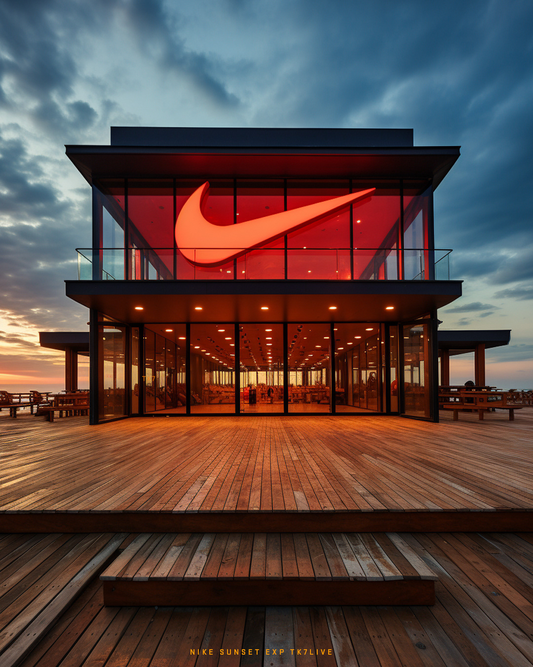 Modern Nike store on the beach, showcasing the latest collections with exclusive availability of the new sneakers.