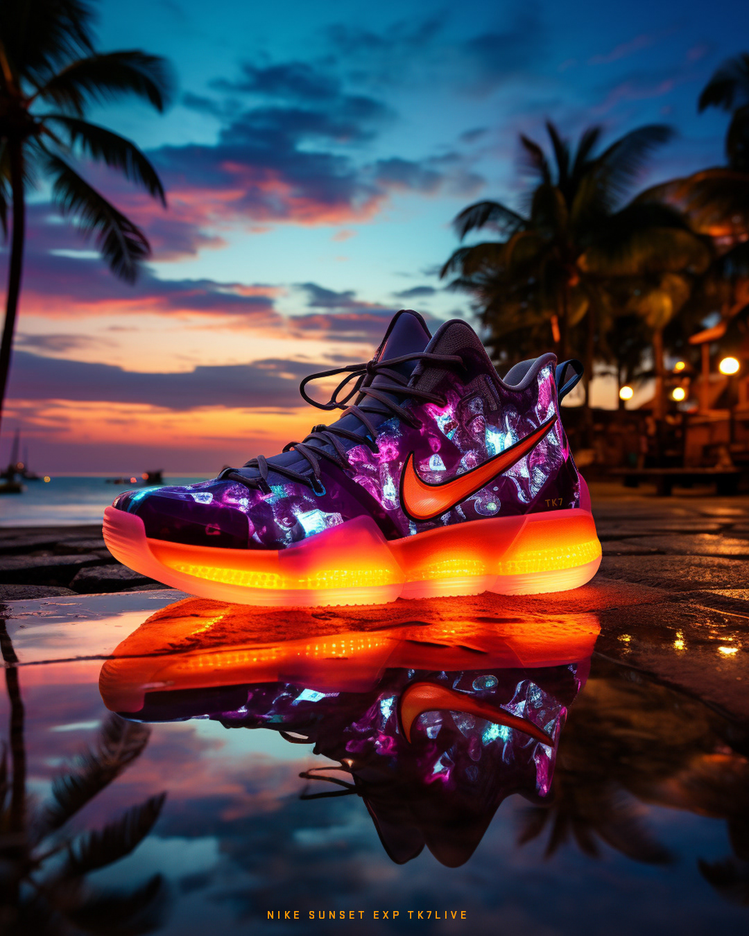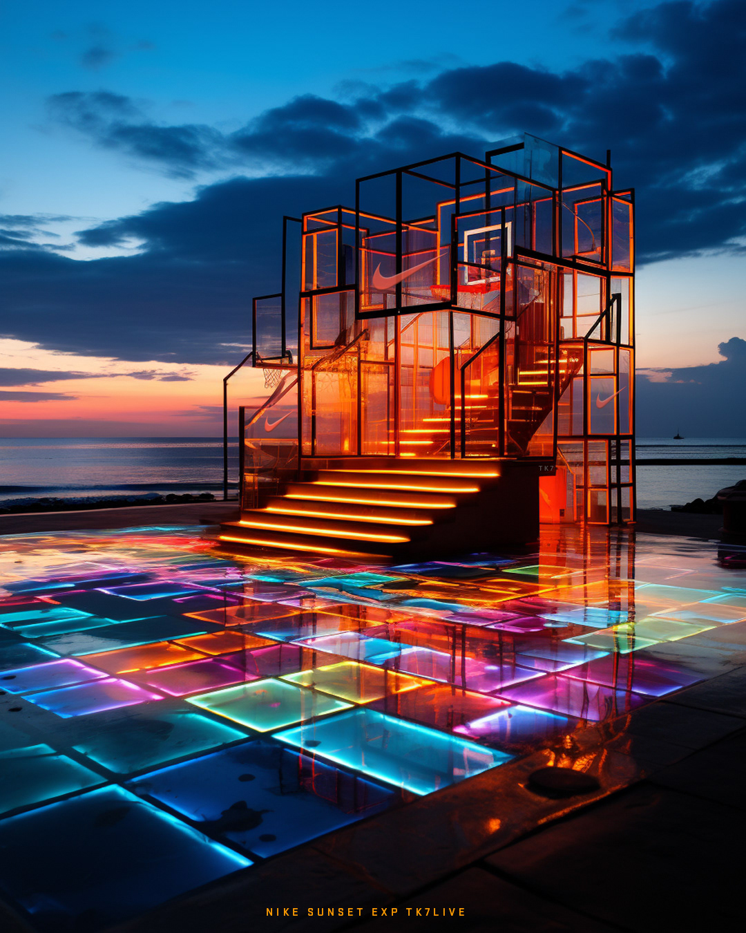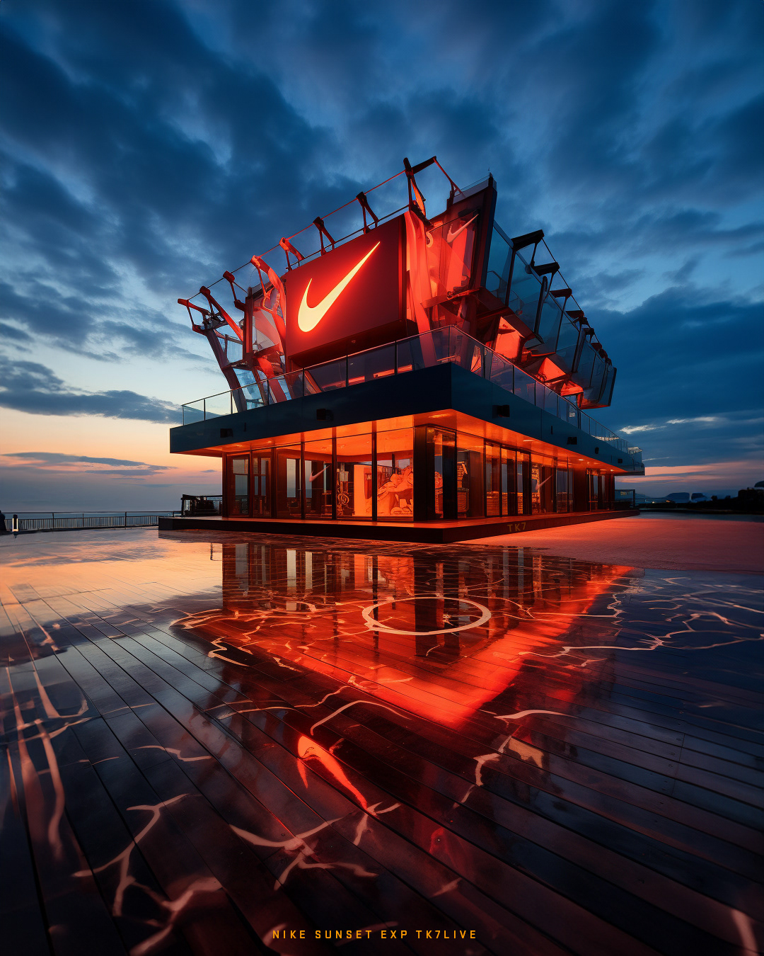 Nike unveils "Sunset EXP,” a limited-edition sneaker release set against the backdrop of a beach pop-up. This experiential event combines style and nature, featuring a modern Nike store with glowing lights, interactive zones, and sunset basketball and fitness sessions.